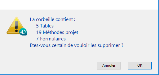 A l’image de la corbeille de Windows ou de Mac OS, la corbeille de 4D est un élément de sécurité de l’interface, réduisant le risque de suppression accidentelle d’objets.