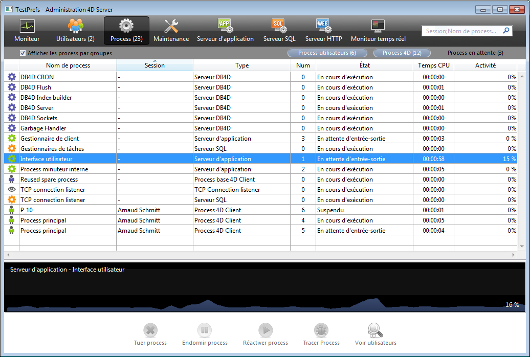 - Process 4D : Process générés par le moteur de 4D Server. Ces process sont précédés d’une icône en forme de roue crantée .