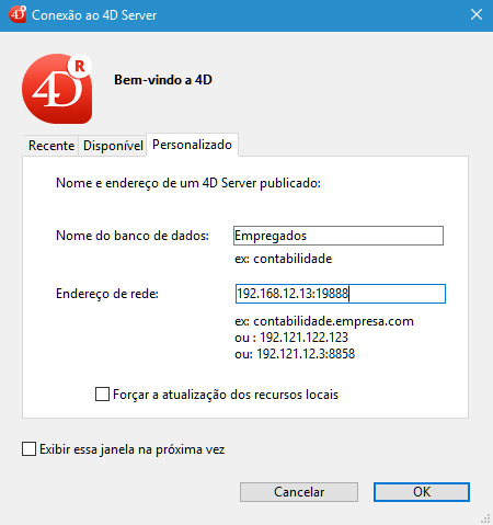 Nota: este parâmetro não é considerado nas aplicações cliente-servidor personalizadas. Em teoria, a aplicação cliente se conecta diretamente à aplicação servidor, sem passar pela caixa de diálogo de conexão. Entretanto, em caso de erro, esta caixa de diálogo aparecerá, neste caso, o nome da publicação da aplicação servidor é o nome do banco compilado.