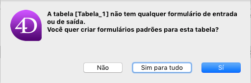 Este menu permite definir o funcionamento de 4D quando se cria uma tabela no editor de estrutura e logo abre, por exemplo, a janela de visualização de registros. Por padrão, 4D lhe indica que nenhum formulário foi criado para a nova tabela e lhe dá a opção de criar um formulário de entrada ou um formulário de saída automaticamente: