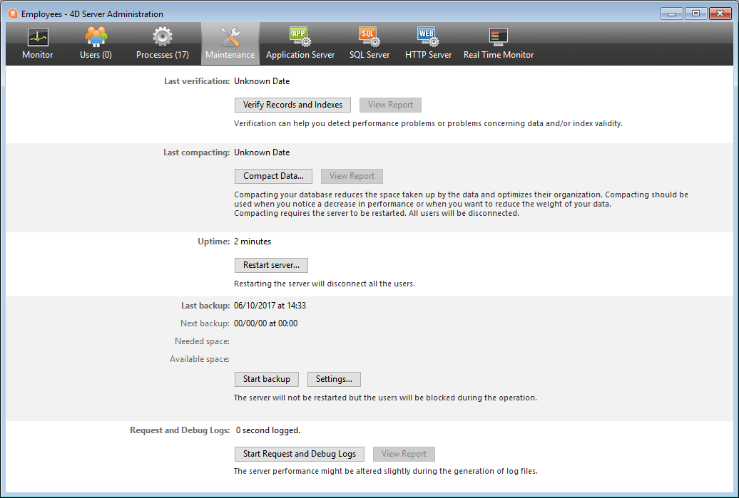 Nota: si la petición de compactación se lleva a cabo desde un equipo 4D client remoto, esta máquina es reconectada automáticamente por 4D Server.