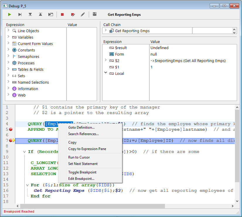 Nota: también puede definir puntos de interrupción directamente en el editor de métodos de 4D. Consulte la sección Puntos de interrupción.