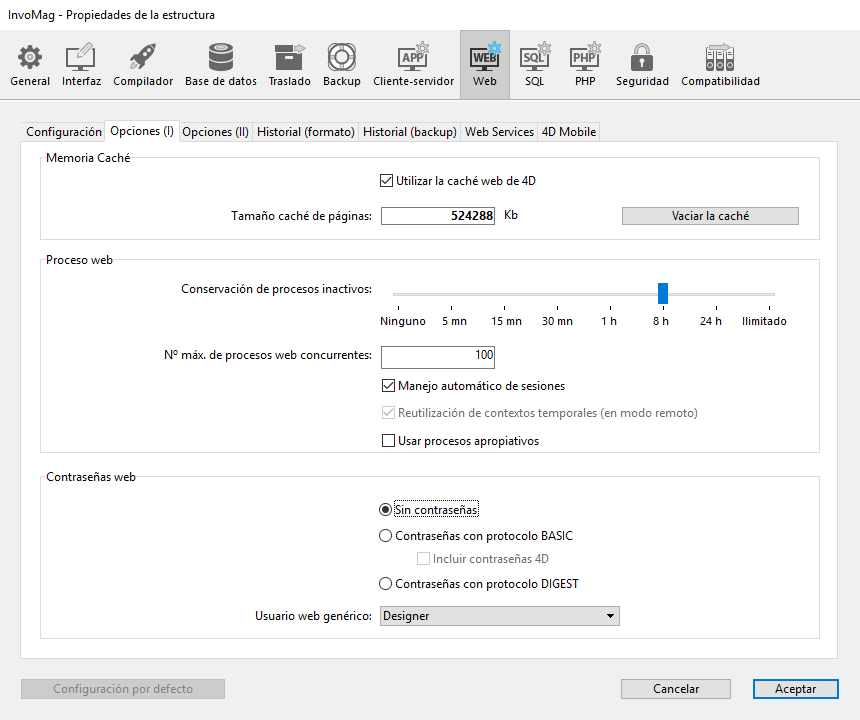 Puede configurar el funcionamiento del servidor web 4D utilizando los parámetros definidos en la página Web de las Propiedades de la base. Esta sección describe los parámetros de las pestañas Configuración, Opciones (I) y (II) de esta página.