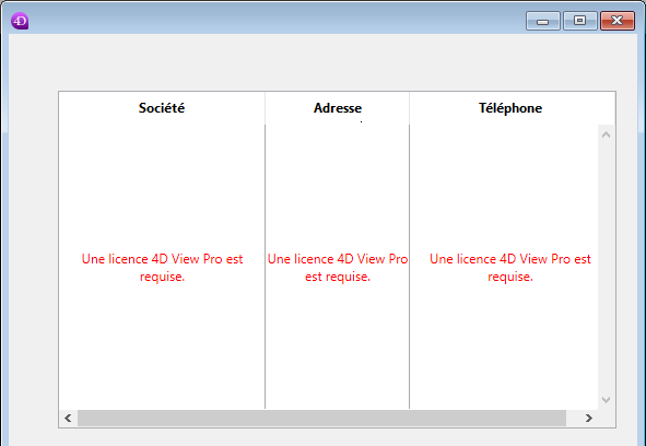 Cependant, 4D View Pro requiert la même licence que 4D View. La licence 4D View doit être installée dans votre application pour que vous puissiez utiliser les fonctionnalités de 4D View Pro. Lorsque cette licence n'est pas installée, le contenu d'un objet utilisant une fonctionnalité 4D View Pro (list box ou zone 4D View Pro) n'est pas affiché à l'exécution et un message d'erreur est affiché à sa place.