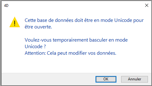 Si vous ouvrez votre application en 4D v18 (qui est en 64 bits), et que votre application de départ n'est pas en unicode, 4D vous proposera de passer temporairement votre base en unicode.