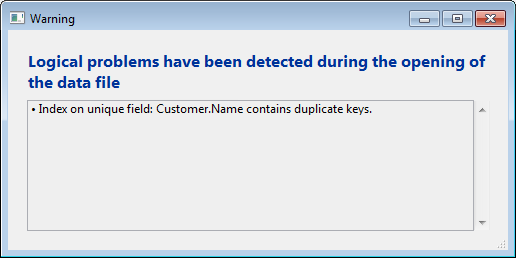 Quando 4D abrir um arquivo de dados, se for necessário construir (ou reconstruir) um índice, os duplicados são detectados automaticamente em qualquer campo associado que seja declarado único.Neste caso, se mostra um quadro de diálogo de alerta específico antes de abrir o banco de dados, oferecendo ao usuário a informação necessária para identificar e eliminar os duplicados: