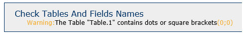 To help developers bring their applications into compliance with this rule, the Verifying the application action automatically looks for the presence of these unwanted characters in the names of variables, tables, fields, and methods. If these characters are detected, "anomalies" are reported by the MSC and the log file contains the appropriate warnings: