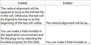Cette propriété peut également être définie au niveau de la list box (pour plus d'informations, veuillez vous reporter au paragraphe Hauteur de ligne automatique dans la section Propriétés spécifiques des List box). Lorsque la fonctionnalité "Hauteur de ligne automatique" est déjà activée au niveau de la list box, désélectionner cette option pour la colonne signifie que le contenu de la colonne doit être exclu du calcul de la hauteur des lignes.