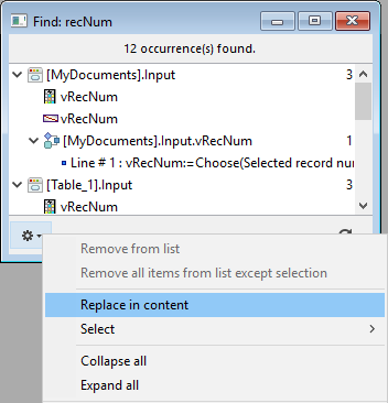 Nota: el elemento de menú Reemplazar en el contenido está deshabilitado si trabaja en una base de datos de solo lectura (por ejemplo, en un archivo .4dz).