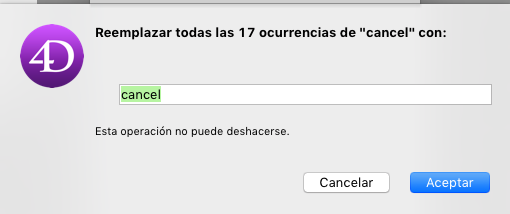• Si un método o un formulario afectado por una operación "reemplazar en el contenido"  está siendo editado por la aplicación 4D, se modificará directamente en el editor abierto (sin advertencia). Los formularios y métodos modificados de esta manera no se guardan de forma automática: tendrá que utilizar el comando Guardar o Guardar todos para validar los cambios.