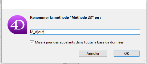 4D propose une fonction de renommage des méthodes projet et des variables avec propagation dans toute la base. Cette fonction est accessible :