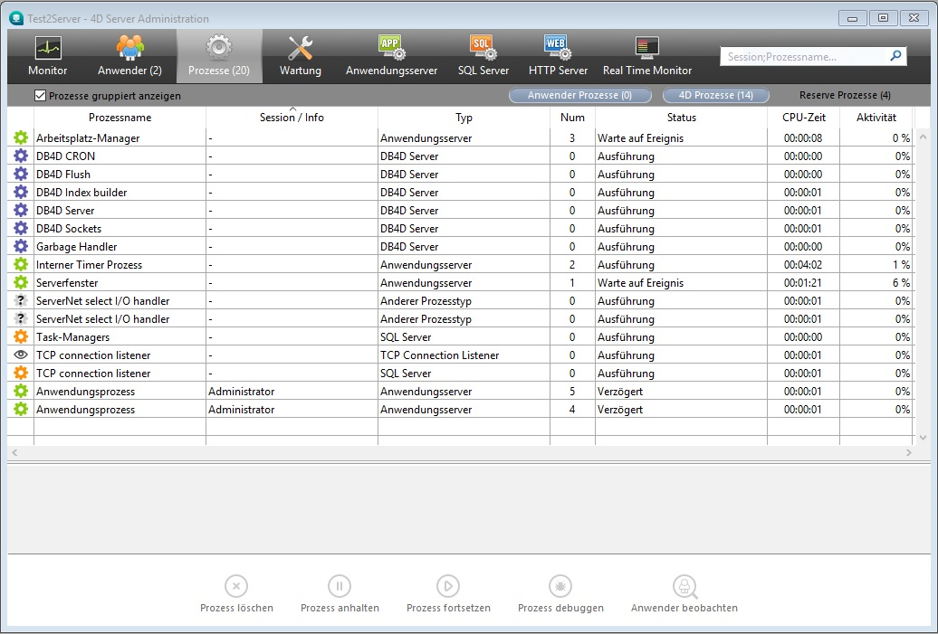- Session (bei einem 4D Prozess leer, zeigt bei einem Anwenderprozess den Namen des 4D Benutzers)