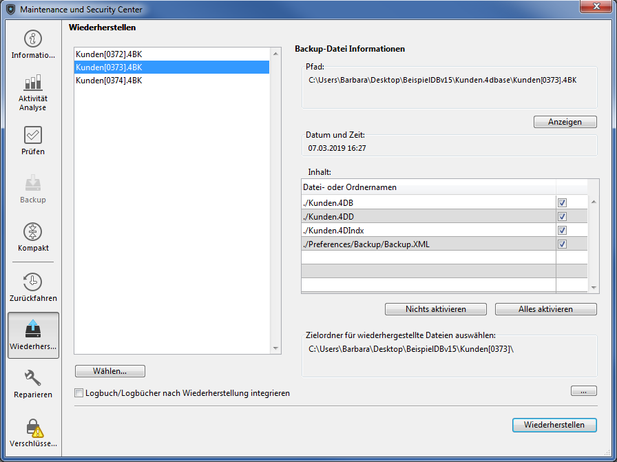 • Inhalt: Inhalt der Backup-Datei. Neben jedem Eintrag in der Liste gibt es ein Ankreuzfeld, über das Sie angeben, ob er wiederhergestellt werden soll. Über die Schaltflächen Nichts aktivieren oder Alles aktivieren stellen Sie die Liste der Einträge zusammen, die Sie wiederherstellen wollen.