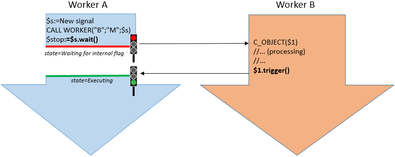 Como un objeto señal es un objeto compartido (ver Objetos y colecciones compartidos), puede utilizarlo para devolver resultados de workers/procesos, llamados, siempre que no olvide escribir valores dentro de una estructura Use...End use (ver ejemplo).