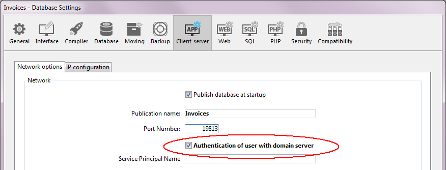 If you want to use Kerberos as your authentication protocol, you also need to fill in the Service Principal Name option on the Client-server/Network options page of the Database Settings dialog box: