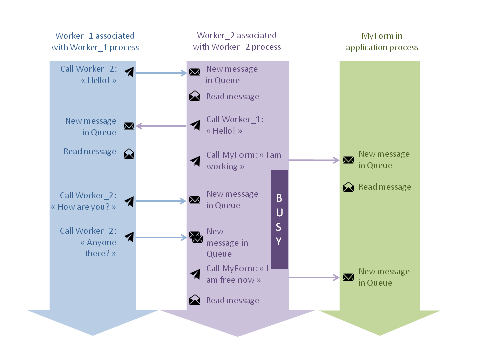 - Worker_1 llama a Worker_2 dos veces, pero, gracias al sistema de mensajería asíncrona, el mensaje simplemente se pone en cola. Se procesan una vez Worker_2 esté disponible, después Worker_2 ha llamado a MyForm.