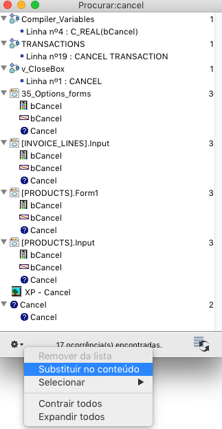 A função de  substituir no conteúdo permite substituir uma string de caracteres por outra dentro dos objetos listados na seção Janela de Resultados. O comando Substituir no conteúdo se encontra disponível no menu de opções da janela: