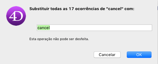 • Se um método ou um formulário afetado por uma operação "substituir no conteúdo" está sendo editado pela aplicação 4D, ele será modificado diretamente no editor aberto (sem advertência). Os formulários e métodos modificados dessa maneira não são guardados de forma automática: terá que utilizar o comando Salvar ou Salvar todos para validar as mudanças.