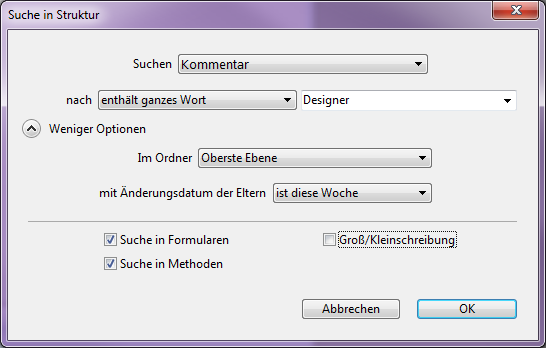 Suche in Methoden: Ist diese Option nicht markiert, läuft die Suche in der Datenbank mit Ausnahme von Methoden und Methodennamen.