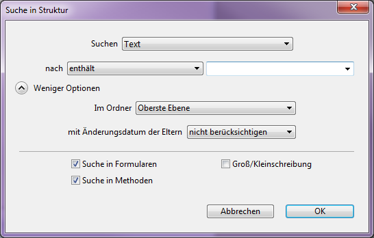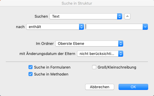 Klicken Sie in der Werkzeugleiste auf die Lupe ODER Wählen Sie im Menü Bearbeiten den Befehl Suche in Struktur. Das Fenster erscheint auf dem Bildschirm: