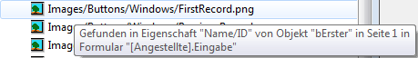 Jede Zeile kann einen Tipp mit zusätzlichen Informationen anzeigen, z.B. die Eigenschaft des Elements, das zum Suchergebnis passt oder die Nummer der Formularseite, wo das Element vorkommt: