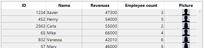 En el list box, cada columna se refiere a una de las propiedades del objeto, ya sea directamente (This.name), indirectamente (This.employees.length), o mediante una expresión (getPicture) en la que se puede usar directamente. El list box se ve así: