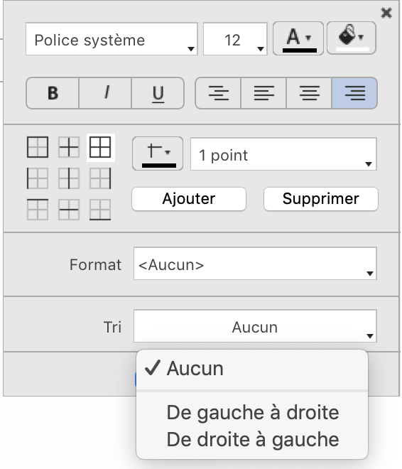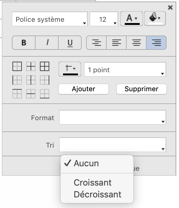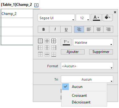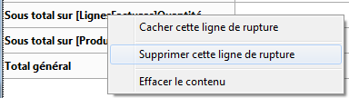 Le niveau de rupture est supprimé. A noter que dans les deux cas, la colonne n'est plus triée. Si vous souhaitez trier une colonne sans ajouter de niveau de rupture correspondant, cachez simplement la ligne de rupture à l'aide du menu contextuel (cf. Cacher des lignes ou des colonnes).