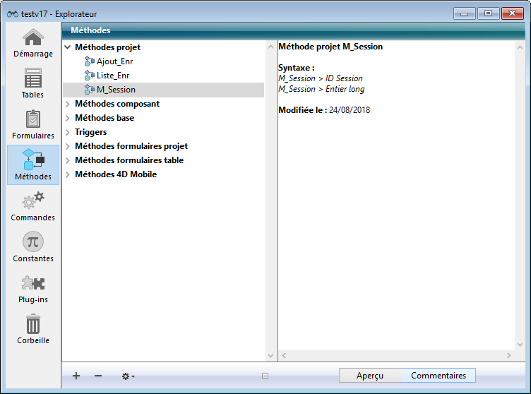 Note de compatibilité : Depuis la version 12 de 4D, les commentaires insérés dans l'en-tête d'une méthode via les caractères // sont affichés sous forme d'infobulles lorsque la méthode est référencée dans une autre méthode (cf. paragraphe "Utiliser les infobulles" dans la section WA SET EXTERNAL LINKS FILTERS). Cette fonction, très utile pour documenter les méthodes utilisateur, n'est pas compatible avec les commentaires placés dans l'Explorateur. Si vous souhaitez utiliser les en-têtes des méthodes en tant que zones de documentation, ne saisissez pas de commentaires dans l'Explorareur.