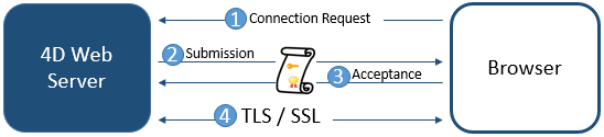 El servidor web 4D puede comunicarse en modo seguro vía el protocolo TLS (Secured Socket Layer), el sucedor de SSL (Secured Socket Layer). Por defecto, la versión mínima soportada en 4D es TLS 1.2.