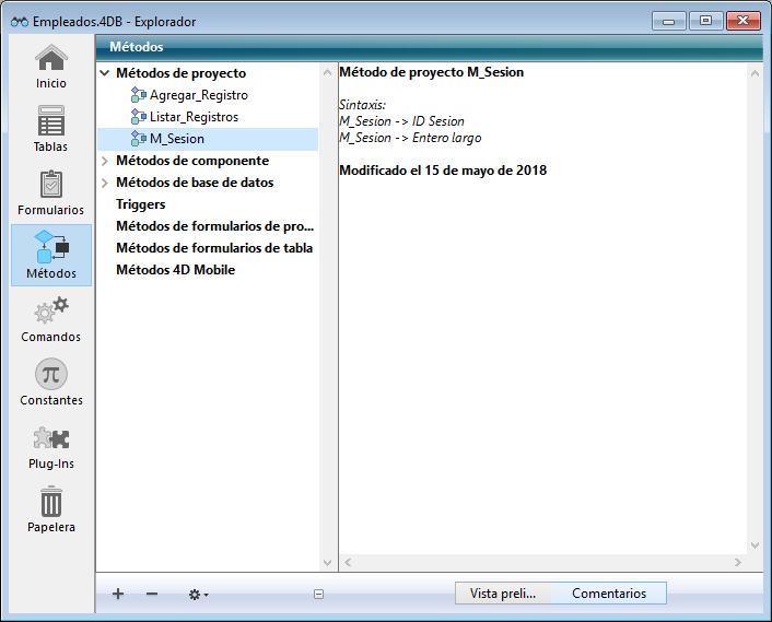 Adicionalmente, puede generar comentarios automáticos, es decir cuyo contenido es actualizado automáticamente por 4D cuando un objeto se crea o modifica.