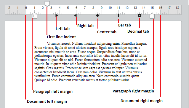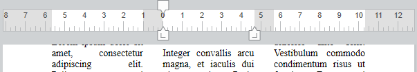 Pode modificar margens esquerda e direita, indentações e posições de tabulação clicando e arrastando os símbolos correspondentes na régua horizontal: