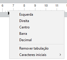 Para criar uma tabulação, dê um clique direito diretamente na régua e escolha seu tipo do menu contextual; um clique esquerdo automaticamente cria uma aba esquerda padrão. Pode também dar um clique direito em tabulações existentes para modificar seu tipo usando o menu contextual.