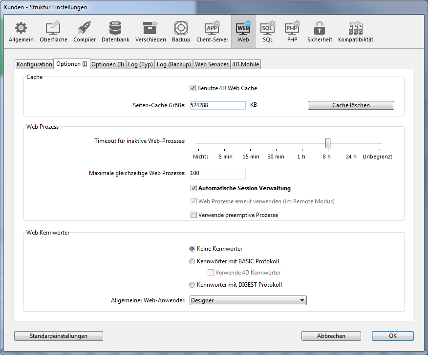 * 4D weist einem Web Prozess als Speichergröße ca. 512 KB zu. Dieser Wert kann je nach Kontext variieren.