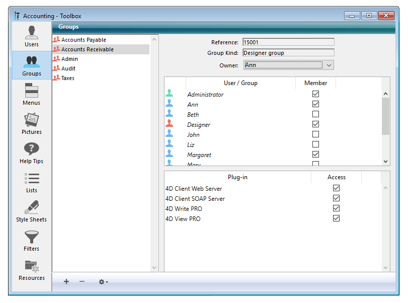 これを行うには、4Dでツールボックスのグループページを表示します (これらのパラメーターを変更する権限を持っていなければなりません)。