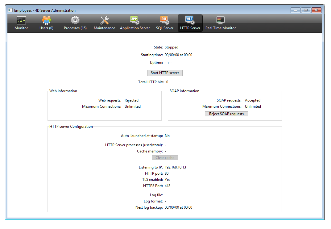 Tip: データベースをWebに公開するために、4Dを終了して再起動する必要はありません。必要な時にWebサーバーを停止し、また開始することができます。これを行うには実行メニューを使用する、HTTPサーバー開始ボタンを使用する、またはWEB START SERVER と WEB STOP SERVERコマンドを使用します。