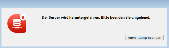 Gleichzeitig erhalten alle Arbeitsstationen eine entsprechende Meldung. Der Benutzer kann die noch verbleibende Zeit weiterarbeiten. Dieses Dialogfenster wird alle 20 Sekunden wiederholt, um die Arbeitsstationen zum Beenden aufzufordern. Ist die Zeit abgelaufen, beendet der Server, auch wenn noch Client-Rechner angemeldet sind.