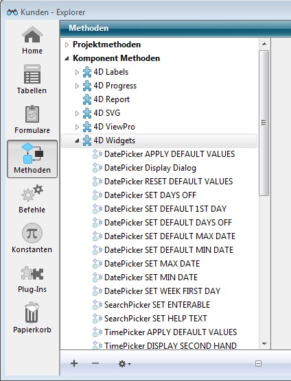Sie sind mit oder ohne Programmierung verwendbar. Sie können sie mühelos in Ihre Formulare integrieren und mit ihren Standardeigenschaften verwenden. Wollen Sie die Widgets nach eigenen Vorstellungen steuern und konfigurieren, können Sie spezifische Projektmethoden, genannt "Komponent-Methoden" verwenden. Sie erscheinen im Explorer auf der Seite Methoden und sind nach Komponente sortiert: