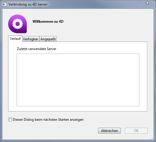 Hinweis: Sie können dieses Dialogfenster auch öffnen, wenn Sie im 4D Willkommen-Assistent auf den Link Anmelden an 4D Server klicken.