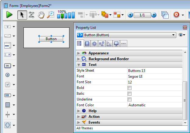 変数が割り当てられたシンプルボタンを追加します。アクションはメソッド、またはプロパティリストの標準アクションで指定します。また、編集可能なスタイルシートも関連づいています。