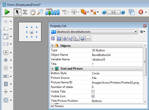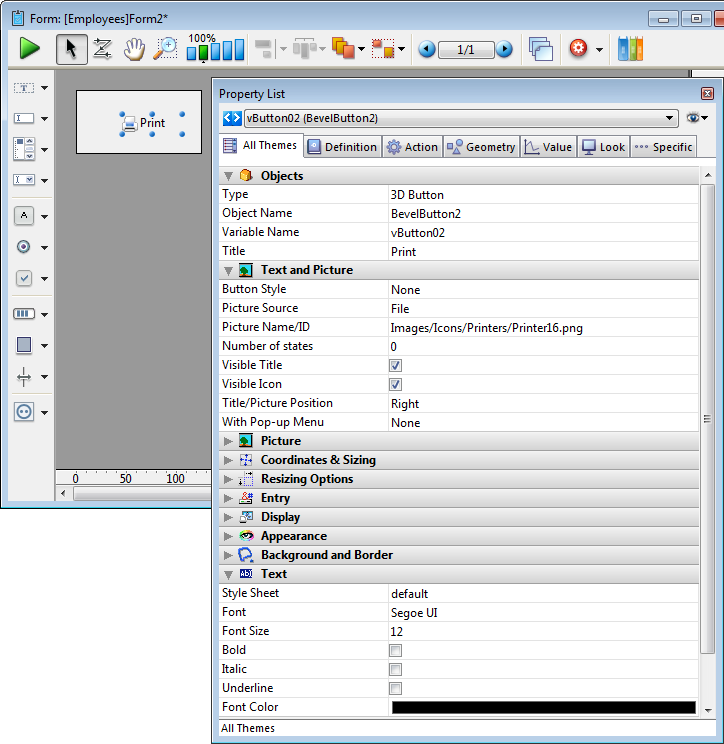 フォーマット済みのツールバー 3D ボタンを追加します。プロパティリストにて、プロパティを変更できます。