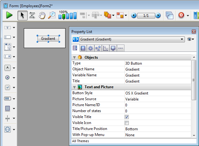 フォーマット済みのグラデーション 3D ボタンを追加します (Mac のみ)。プロパティリストにて、プロパティを変更できます。