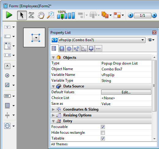 配列型変数が割り当てられたポップアップメニューを追加します (ほとんどのデータタイプを表示できます)。プロパティリストにて、プロパティを変更できます。