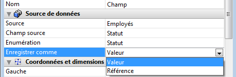 Lorsque vous avez associé une énumération et une énumération de valeurs obligatoires à un champ ou une variable, vous pouvez utiliser l'option Enregistrer comme Valeur/Référence dans le thème "Sources de données" de la Liste des propriétés.