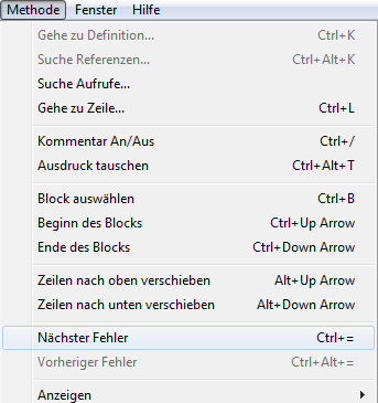 Die Schaltfläche Prüfe Syntax startet die Syntaxprüfung. Die gefundenen Fehler erscheinen im darüberliegenden Informationsbereich. Sie können auf eine Zeile doppelklicken, um die Methode im Methodeneditor zu öffnen.