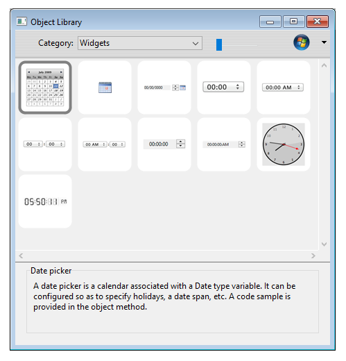 Os widgets 4D são funcionalidades oferecidas como componentes, acessíveis desde o editor de formulários e a livraria de objetos configurados. Estes widgets são objetos compostos com características predefinidas que facilitam o acesso as funcionalidades padrão e são muito simples de implementar.