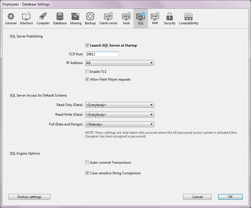 ADVERTÊNCIA: este mecanismo se baseia nas senhas de 4D. Para que o controle de acesso ao servidor SQL tenha efeito, o sistema de senhas de 4D deve estar ativo (uma senha deve ser atribuída ao Designer).