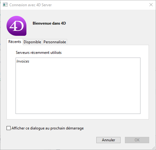 Si vous cochez l'option Afficher ce dialogue au prochain démarrage, cette boîte de dialogue sera automatiquement affichée au démarrage de l'application 4D.