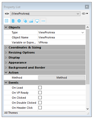 Un área de formulario 4D View Pro se configura mediante propiedades estándar que se encuentran en la Lista de propiedades, como Nombre de objeto y Variable o Expresión, Coordenadas, Pantalla, Acción y Eventos.