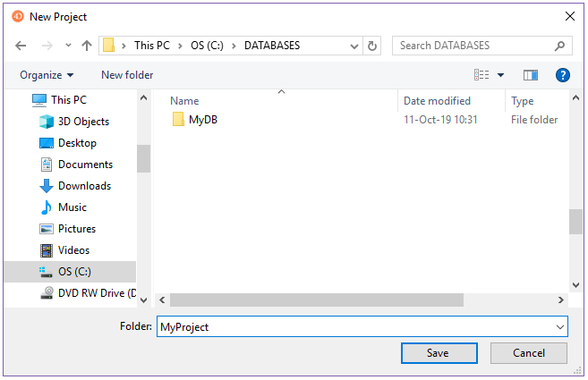 Escolha o nome e a localização do banco de dados a ser criado e clique no botão Salvar.