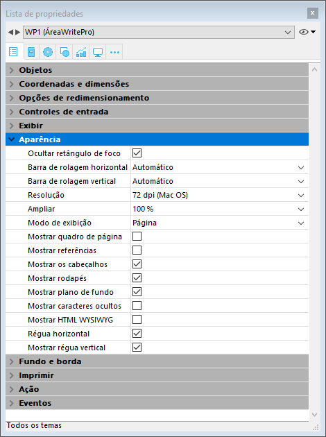 Configurações de vista de documento são gerenciadas através de itens específicos no tema Aparência da lista de propriedades de objetos de formulário 4D Write Pro.: